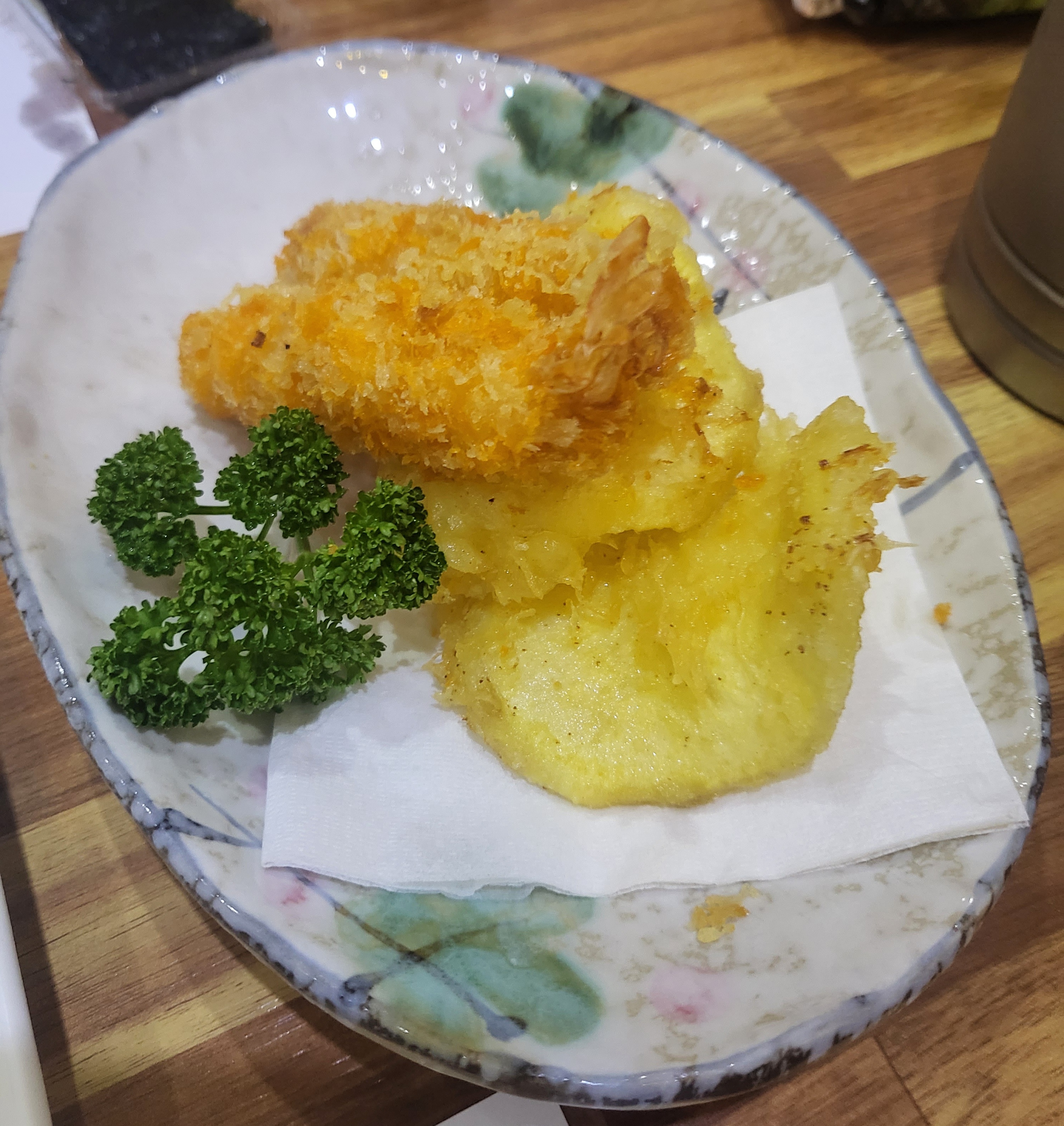 튀김은 새우튀김과 고구마튀김으로 구성되어 있는데요 깔끔하고 바삭하게 튀겨내서