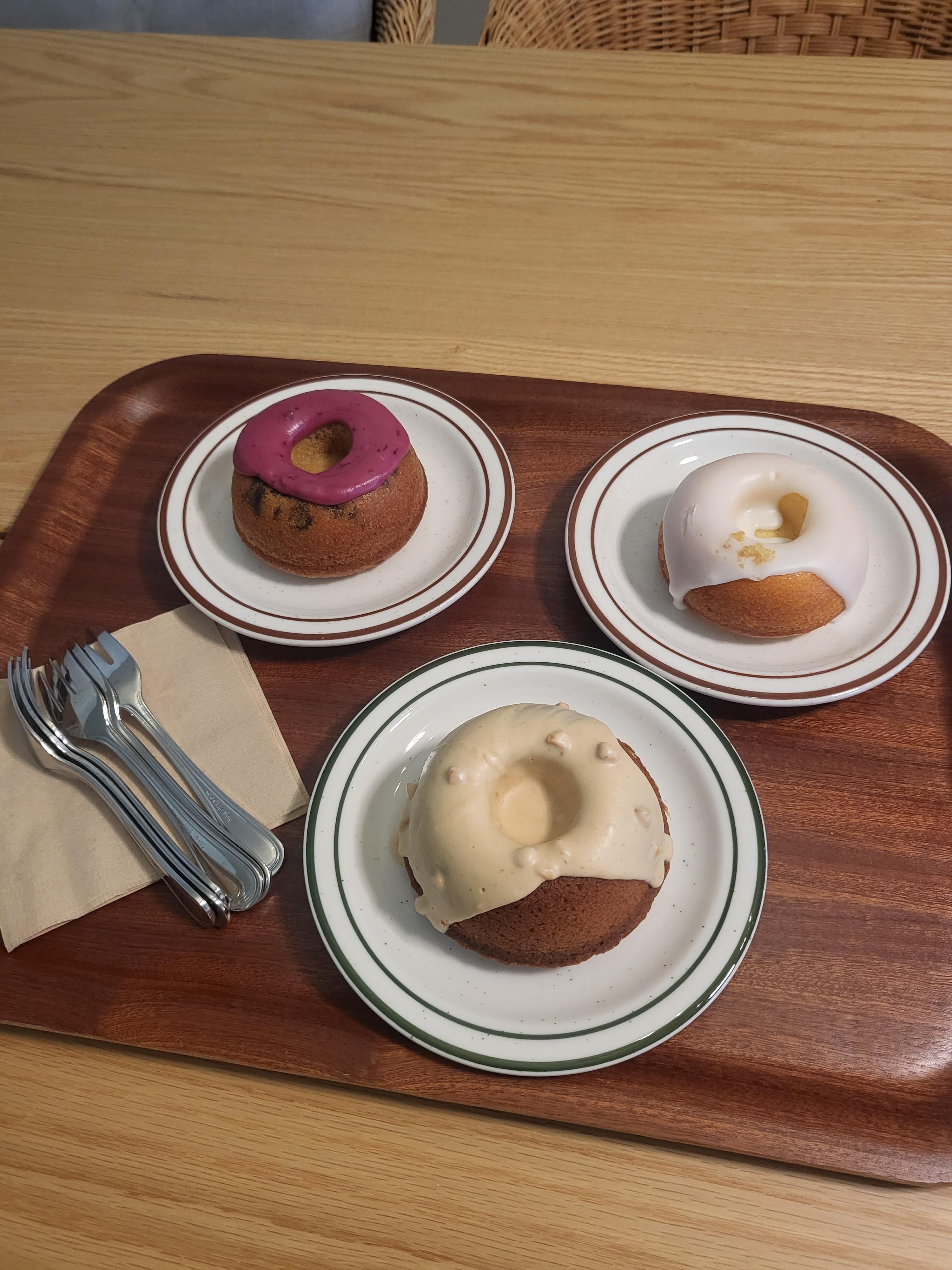 도넛들도 팔고 있어 몇 가지 시켜봤는데요! 같이 온 아기가 블루베리 도넛을 엄청 잘 먹더라고요~