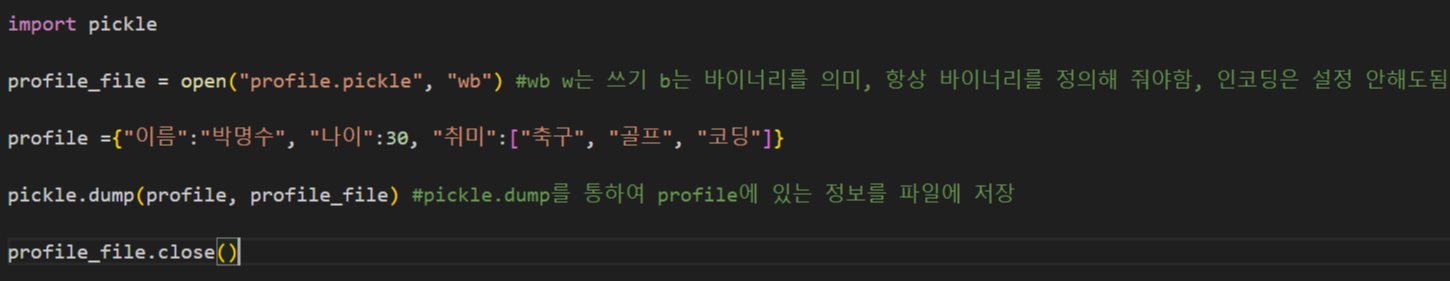 - 객체를 생성하고, pickle.dump를 통하여 profile 객체 정보를 profile_file에 저장.
