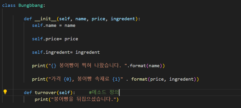 bung3.turnover() 구문에는 사실 tunrover에 매개변수를 넣는 것 같지 않지만 turnover라는 메소드를 호출할때