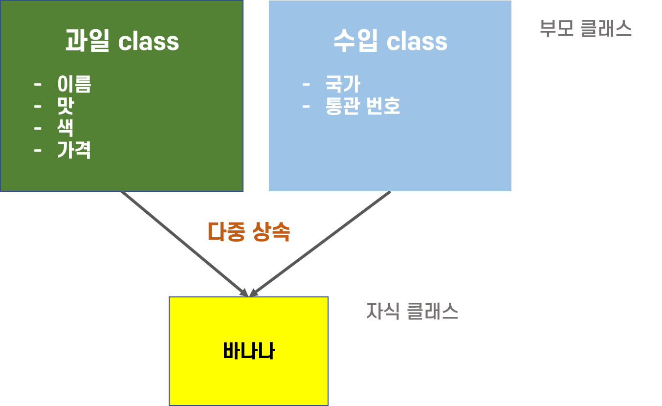 수입과일은 과일 클래스와 수입 클래스에서 다중 상속을 받는다면 특별한 코드 추가 없이 클래스를 정의할 수 있다.