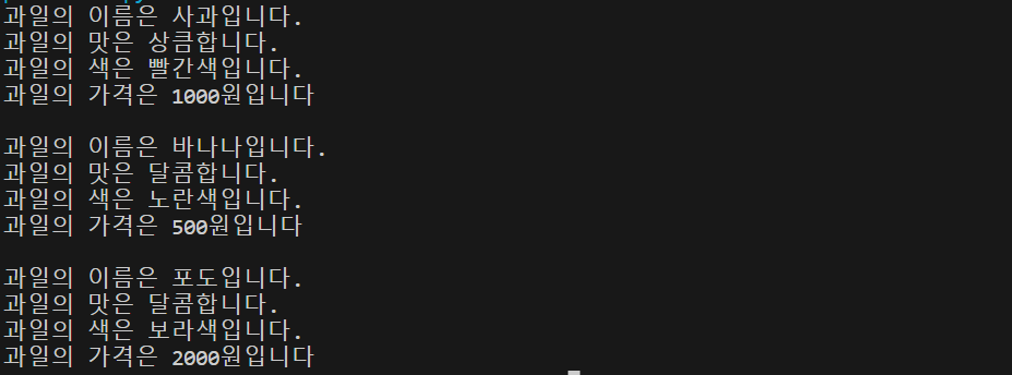 - 예를들어 사과, 바나나, 포도, 딸기 클래스를 정의하고 싶다고 하면 공통적으로 이름, 맛, 재배지, 색, 가격 등 공통적인 특성들이 있는데
