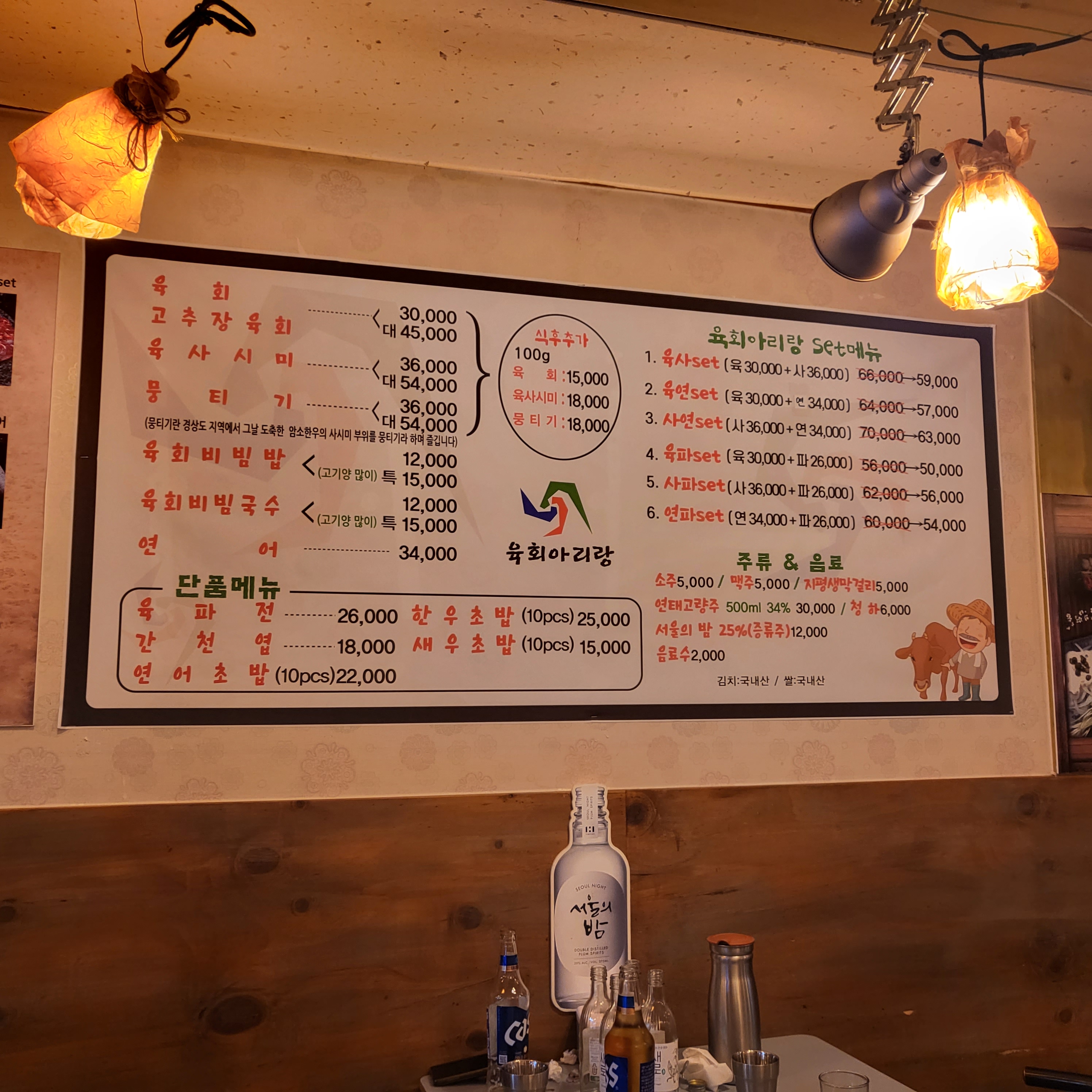 메뉴는 육회, 고추장육회, 윳사시미, 뭉티기, 육회비빔밥, 육회비빔국수, 육파전 등이 있고 세트메뉴도 있습니다.