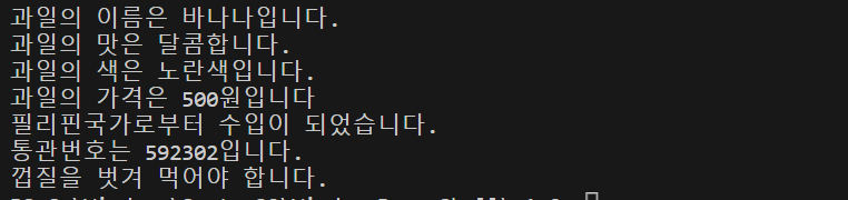 - 과일들은 대부분 씻어먹는 과일이 많기 때문에 '잘 씻어서 먹어야 합니다.'라고 출력하는 메소드를 부모클래스에서 정의했다.