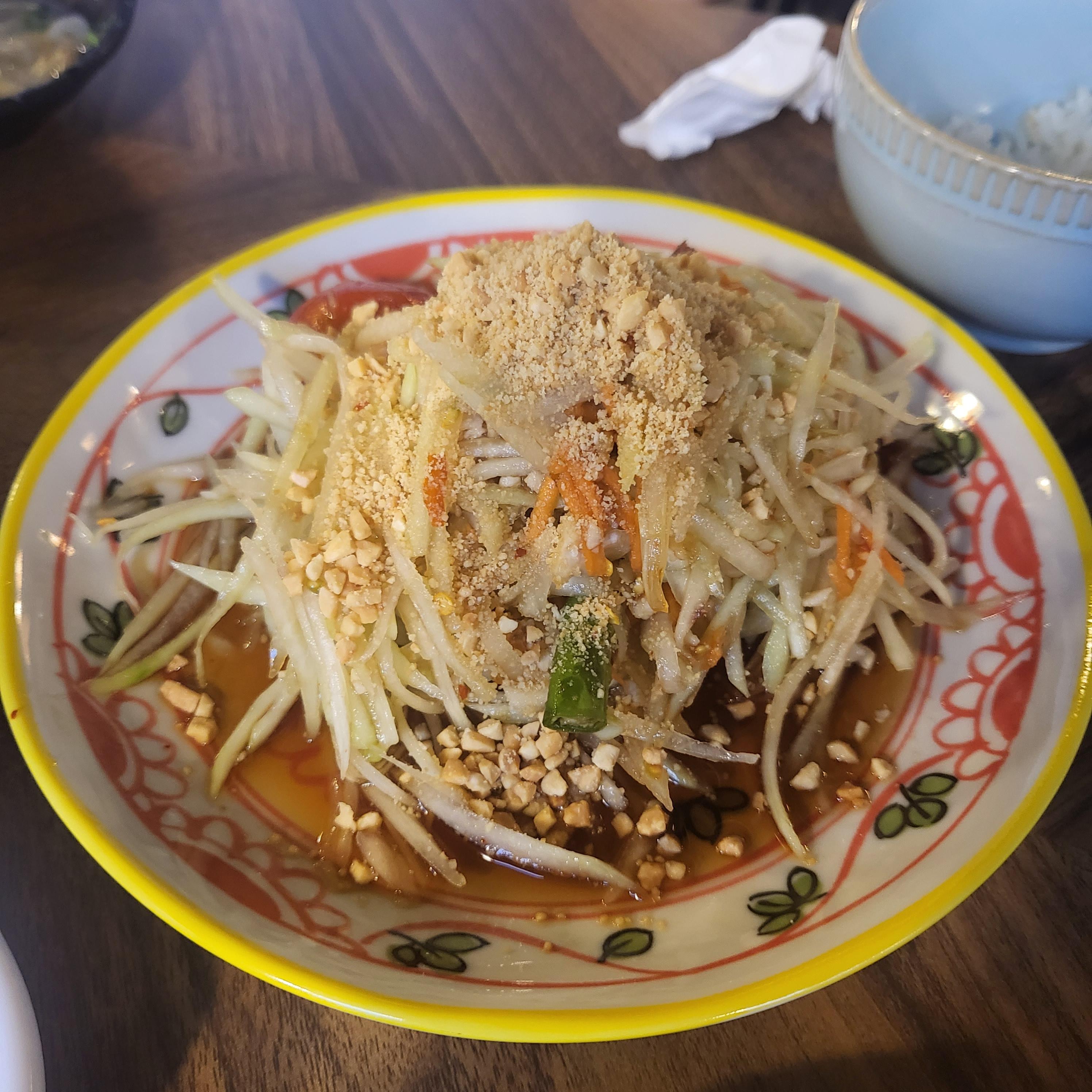 새콤달콤한 소스에 버무려진 파파야 샐러드는 튀기고 볶은 다른 태국음식과 함께 먹기 아주 좋았습니다.
