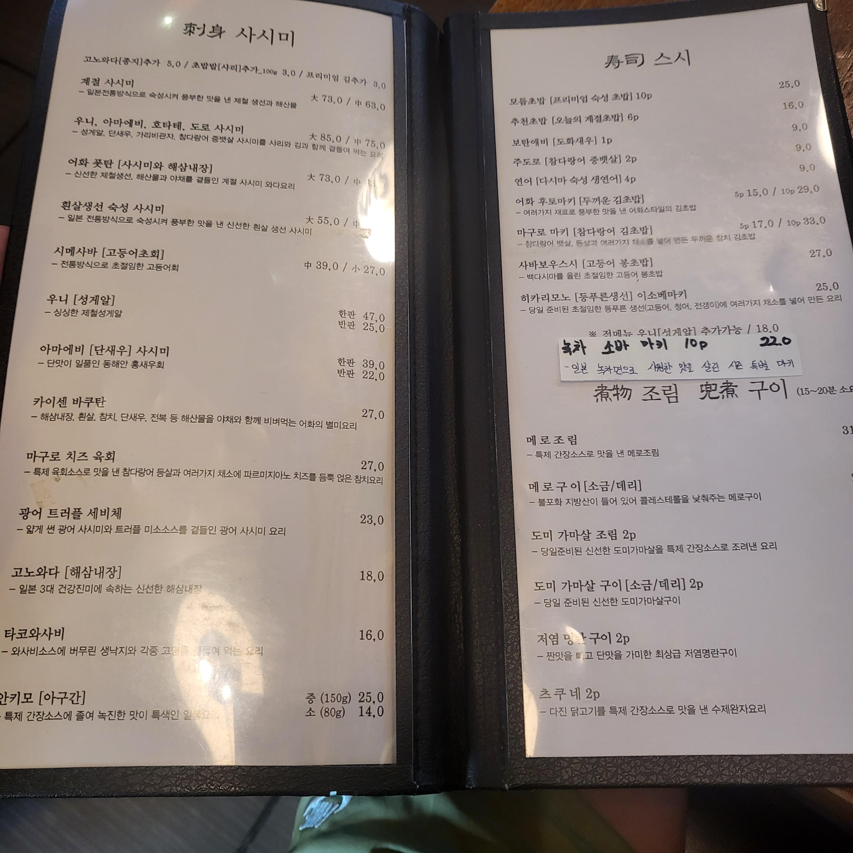 대표메뉴는 계절 사시미, 흰살생선 숙성 사시미가 있고