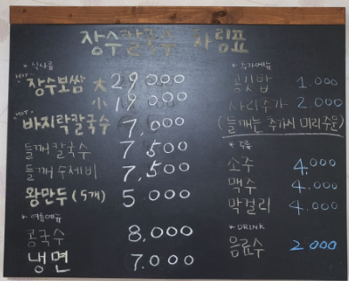 메뉴는 보쌈, 바지락칼국수, 들깨칼국수, 수제비 등이 있어요~